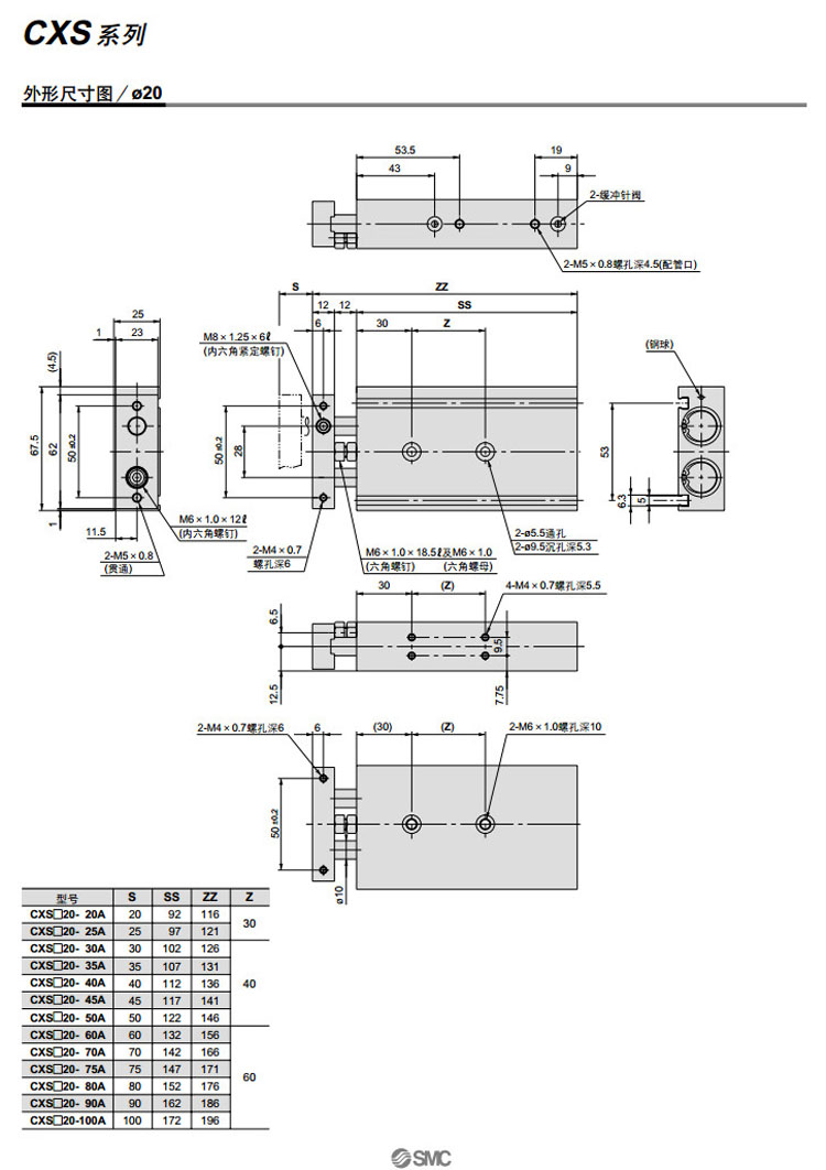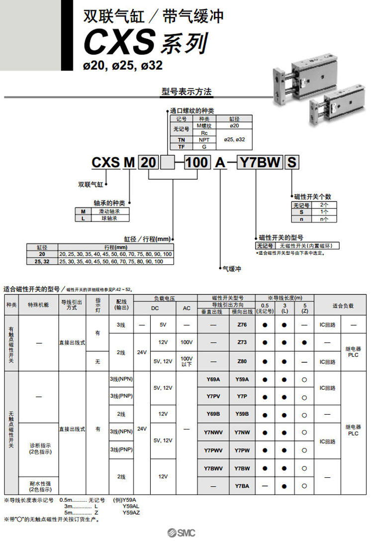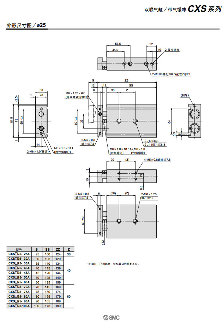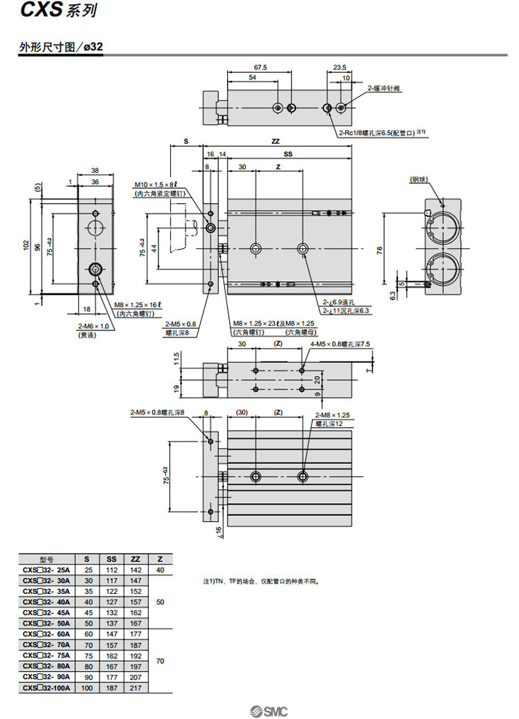 CXSM20-20A,CXSM25-25A,CXSM32-25A,CXSM20-25A,CXSM25-30A,CXSM32-30A,SMC双联气缸
