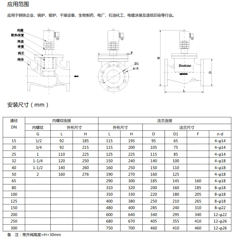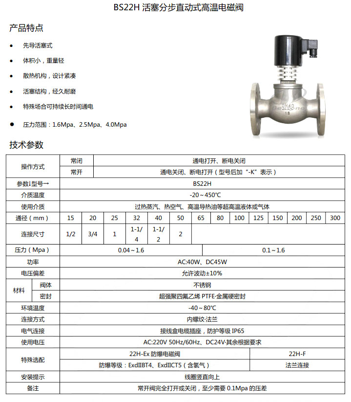 BS22H-DN15,BS22H-DN20,BS22H-DN25,BS22H-DN32,活塞分步直动式高温电磁阀