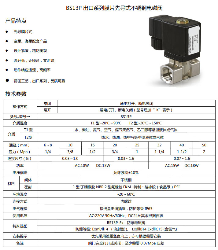 BS13P-DN6,BS13P-DN8,BS13P-DN10,BS13P-DN15,BS13P-DN20,膜片先导式不锈钢电磁阀