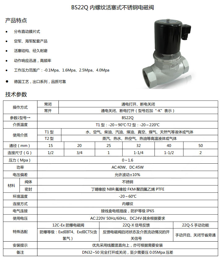 BS12Q-DN15,BS12Q-DN20,BS12Q-DN25,BS12Q-DN32,BS12Q-DN40,BS12Q-DN50,内螺纹蒸汽电磁阀