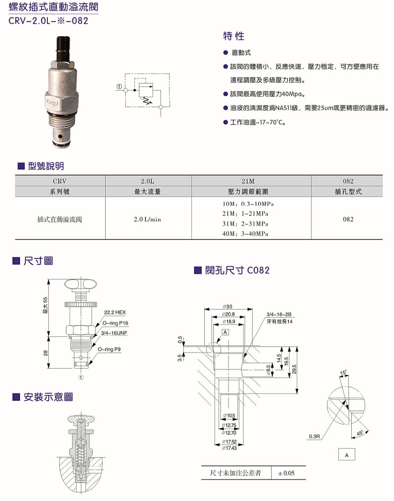 CRV-2.0L-10M-82,CRV-2.0L-21M-82,CRV-2.0L-31M-82,CRV-2.0L-40M-82,螺纹插式直动溢流阀