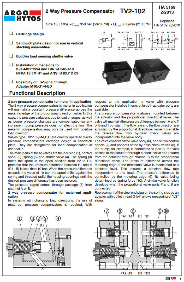 TV2-102/S,TV2-102/MA,TV2-102/MB,TV2-102/MC,TV2-102/MD,TV2-102/ME,TV2-102/MF,ARGO 2路压力补偿器