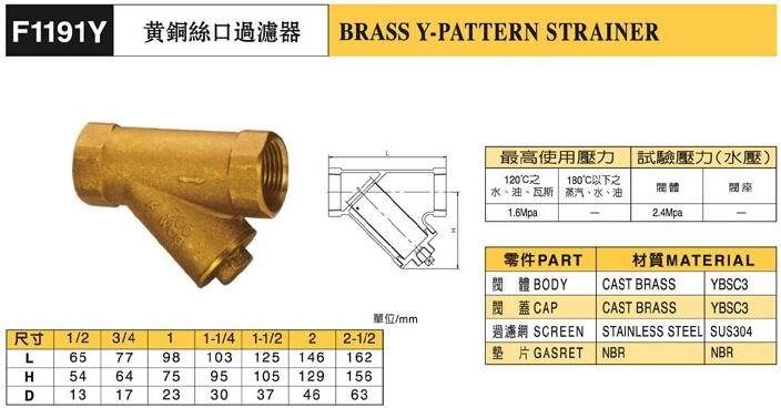 F1191Y黄铜丝口过滤器主要应用于口径较小的管道设备,连接拆卸方便,排污性能可靠,经济适用。是输送介质的管道系统不可缺少的一种装置,通常安装在减压阀、泄压阀、定水位阀等水力控制阀或其它设备的进口端,在管道系统中用于过滤介质颗粒杂质,免受因管道内杂质、铁锈、焊屑等带来的堵塞和损坏,从而避免了维修费用和生产损失,保护阀门等设备的正常使用。