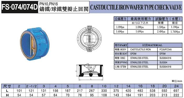 双瓣式止回阀可安装于水泵出口处,能避免产生水锤、水击声和破坏性冲击,达到防止逆流和保护设备的目的。FS-074对夹式止回阀采用流体型设计,水头损失较小;内部弹簧可加速封闭,达到静音效果;金属对金属确保密封的可靠性;安装空间小。广泛用于给排水、消防、建筑、暖通系统。