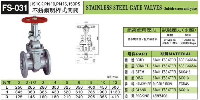 FS031不锈钢明杆式闸阀可广泛用于自来水,污水,建筑,石油,化工,食品,医药,轻纺,电力,船舶,冶金,能源系统等流体管线上作爲调节和截流装置使用。富山引进欧洲高科技阀门制造技术所生産的弹性座封闸阀,利用闸门整体包胶産生变形补偿作用达到良好的密封效果,克服了一般闸阀密封不良、漏水和生鏽的现象。