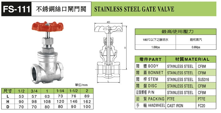 FS-111不锈钢丝口闸阀硅溶胶铸造阀体,工艺美观,标准304材质,无锈斑,美国保险业UL认证。富山丝扣闸阀的启闭件是塞形的阀瓣,密封面呈平面或锥面,阀瓣沿流体的中心线作直线运动。阀杆的运动形式,有升降杆式(阀杆升降,手轮不升降),也有升降旋转杆式(手轮与阀杆一起旋转升降,螺母设在阀体上)。纹管截止阀只适用于全开和全关,不允许作调节和节流。