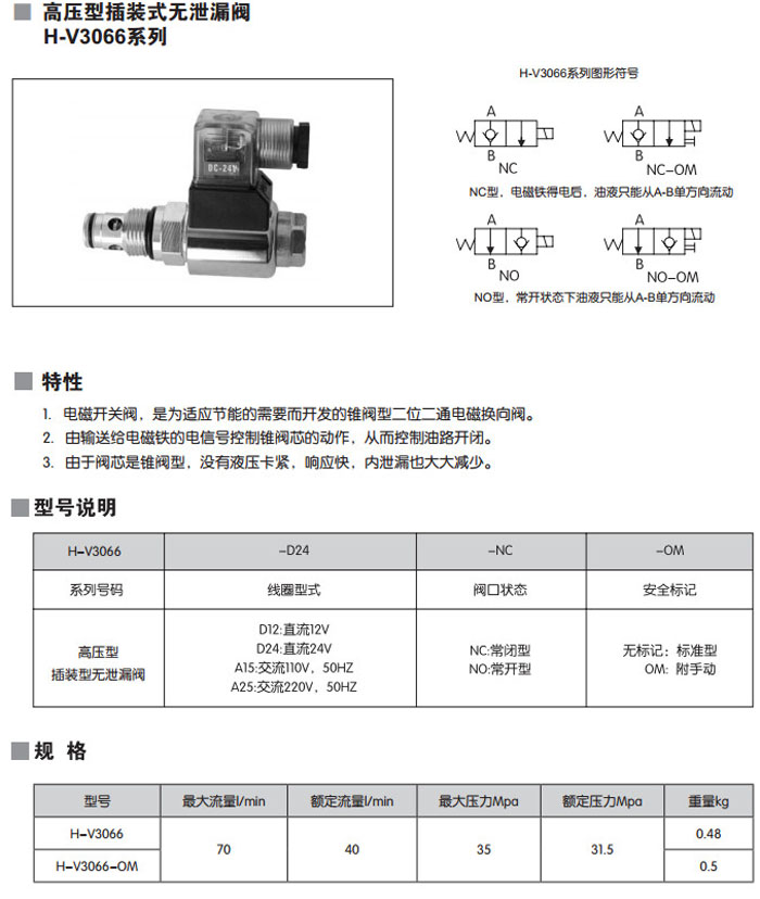 H-V3066-D12,H-V3066-D24,H-V3066-A15,H-V3066-A25,H-V3066-D12-NO-OM,H-V3066-A25-NC,高压型插装式无泄漏阀