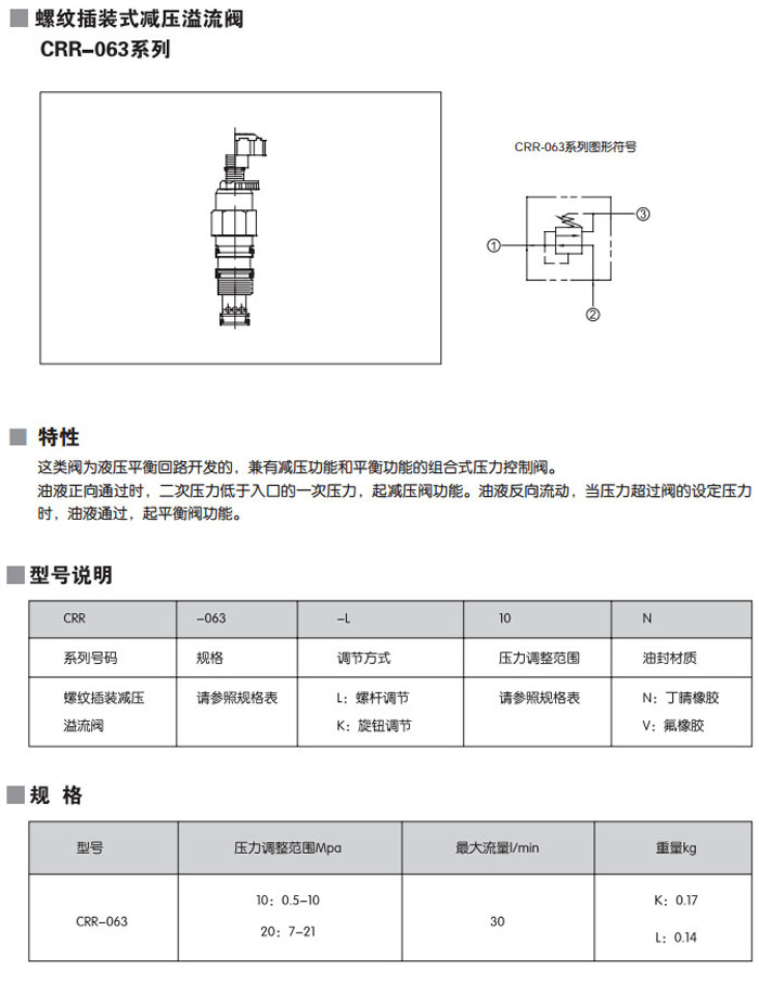 CRR-063-L10N,CRR-063-L20N,CRR-063-L10V,CRR-063-L20V,CRR-063-K10N,CRR-063-K20N,螺纹插装式减压溢流阀