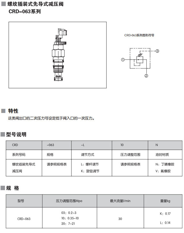 CRD-063-L03N,CRD-063-L10N,CRD-063-L20N,CRD-063-K03N,CRD-063-K10N,CRD-063-L30N,螺纹插装式先导式减压阀
