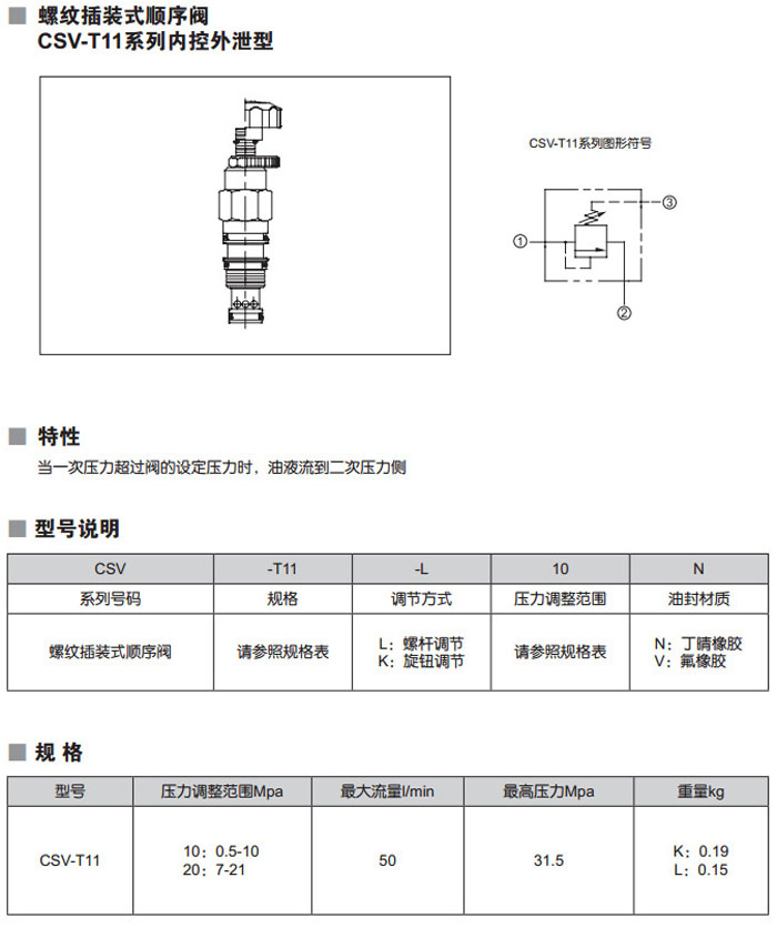 CSV-T11-L10N,CSV-T11-L10V,CSV-T11-K10N,CSV-T11-K10V,CSV-T11-L20N,CSV-T11-L20V,螺纹插装式顺序阀