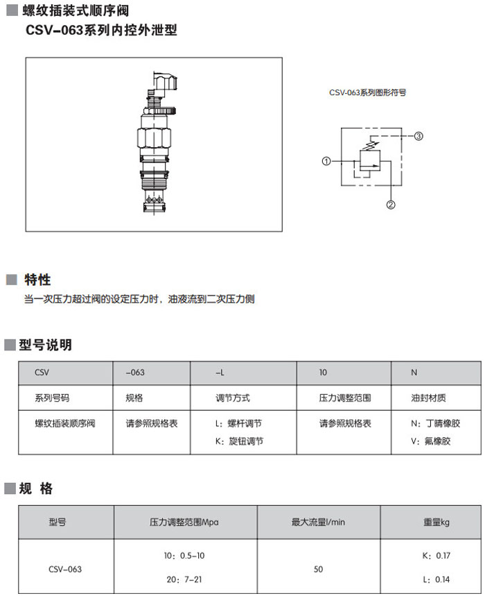 CSV-063-L10N,CSV-063-L20N,CSV-063-K10N,CSV-063-K20N,CSV-063-L10V,CSV-063-L20V,螺纹插装式顺序阀