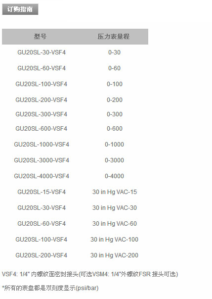 GU20SL-30-VSF4,GU20SL-60-VSF4,GU20SL-100-VSF4,GU20SL-200-VSF4,GU20SL-300-VSF4,压力表