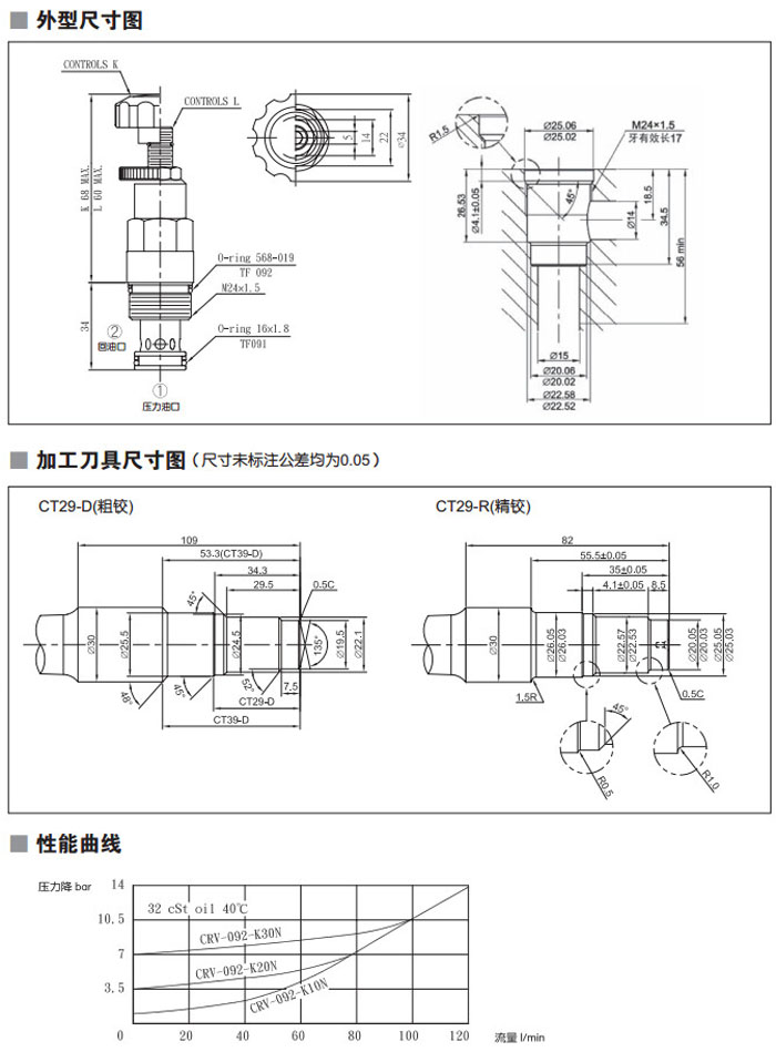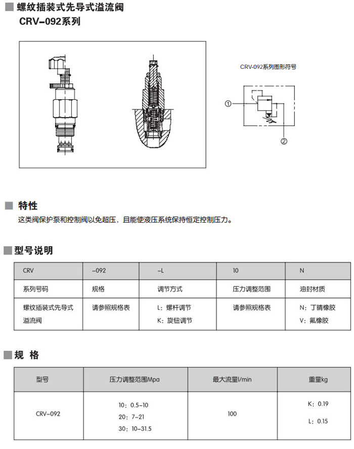 CRV-092-L10N,CRV-092-L20N,CRV-092-L30N,CRV-092-K10N,CRV-092-K20N,CRV-092-K30N,螺纹插装式先导式溢流阀