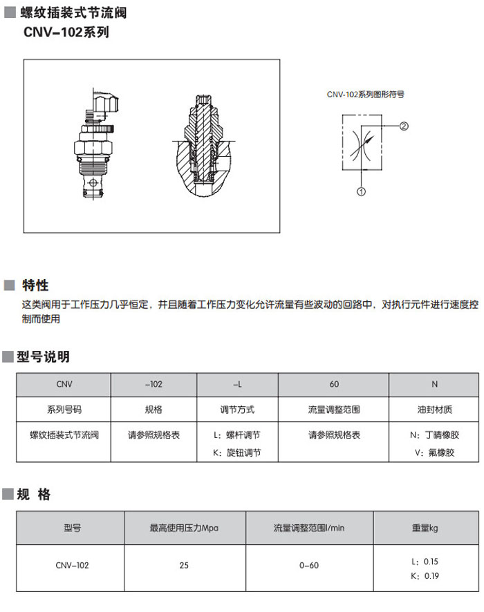 CNV-102-L60N,CNV-102-L60V,CNV-102-K60N,CNV-102-K60V,螺纹插装式节流阀