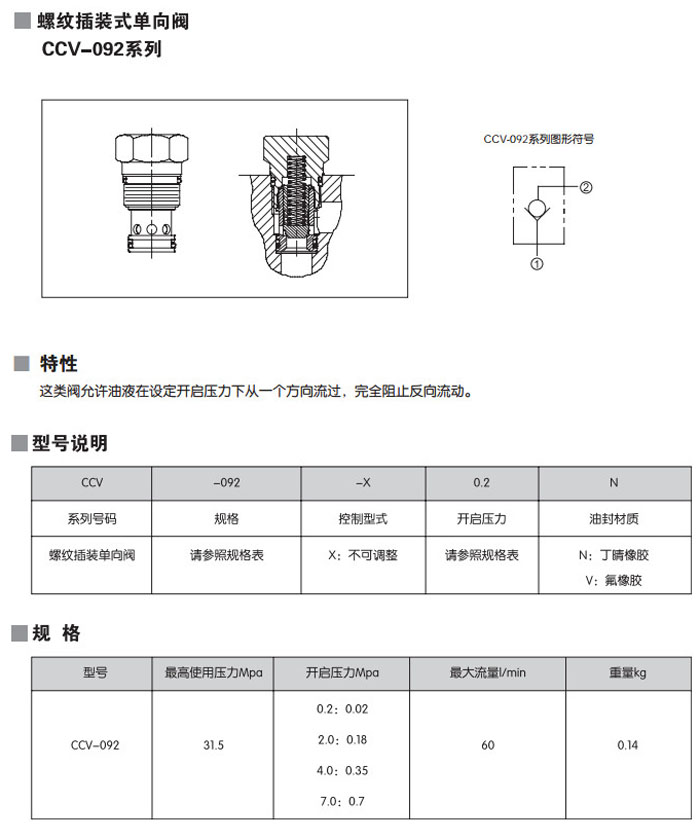 CCV-092-X-0.2N,CCV-092-X-2.0N,CCV-092-X-4.0N,CCV-092-X-7.0N,CCV-092-X-0.2V,螺纹插装式单向阀