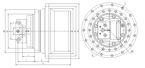 本产品为马达与减速机一体的行走装置。由集成于减速机内部的双排量轴向柱塞马达、行走减速器组成。马达内置安全阀、防反转阀、停车制动装置及高低二档转换装置,它的特点是:传动比范围大、结构紧凑、工作效率高、可靠性强、体积小、运动平稳、噪音低等,同时具有多级安全保护、使用寿命长等优点。适用于液压履带驱动行走装置