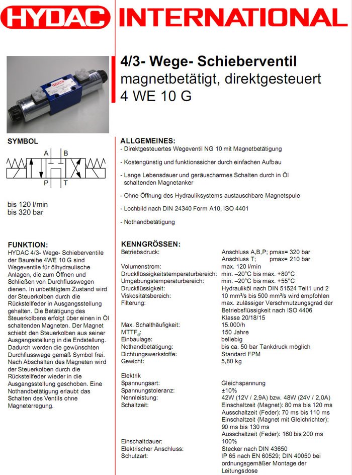 4WE10GS01-12DG/V,4WE10GS01-24DG/V,HYDAC电磁4/3方向滑阀