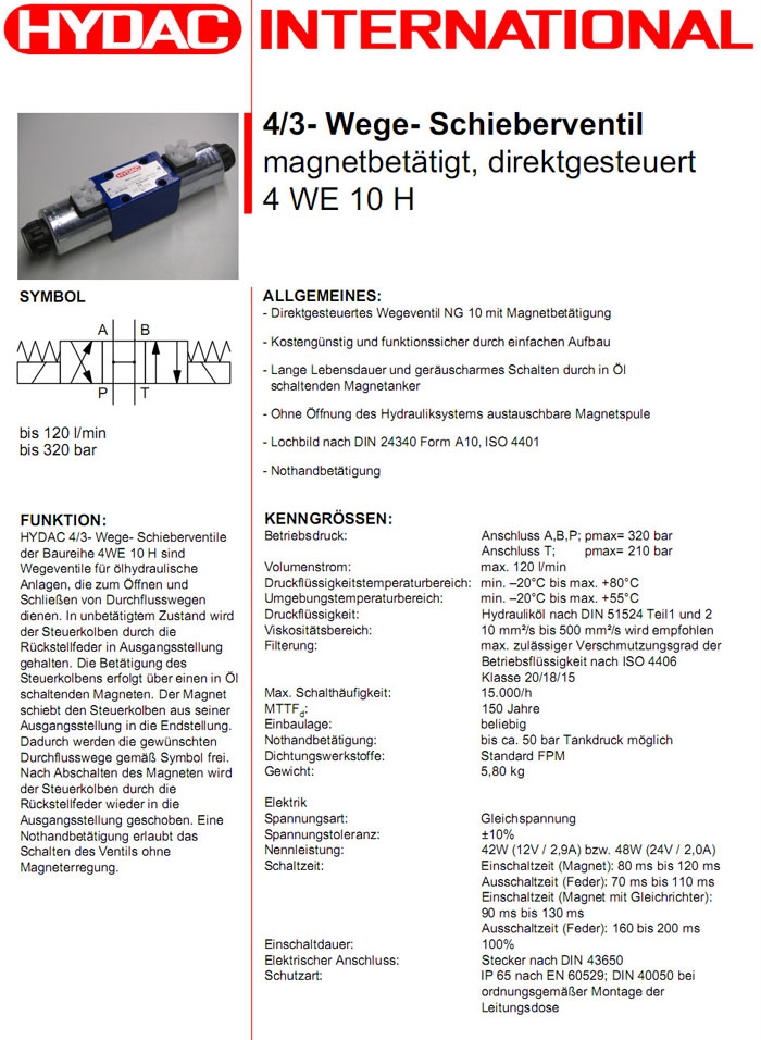 4WE10HS01-12DG/V,4WE10HS01-24DG/V,HYDAC电磁4/3方向滑阀